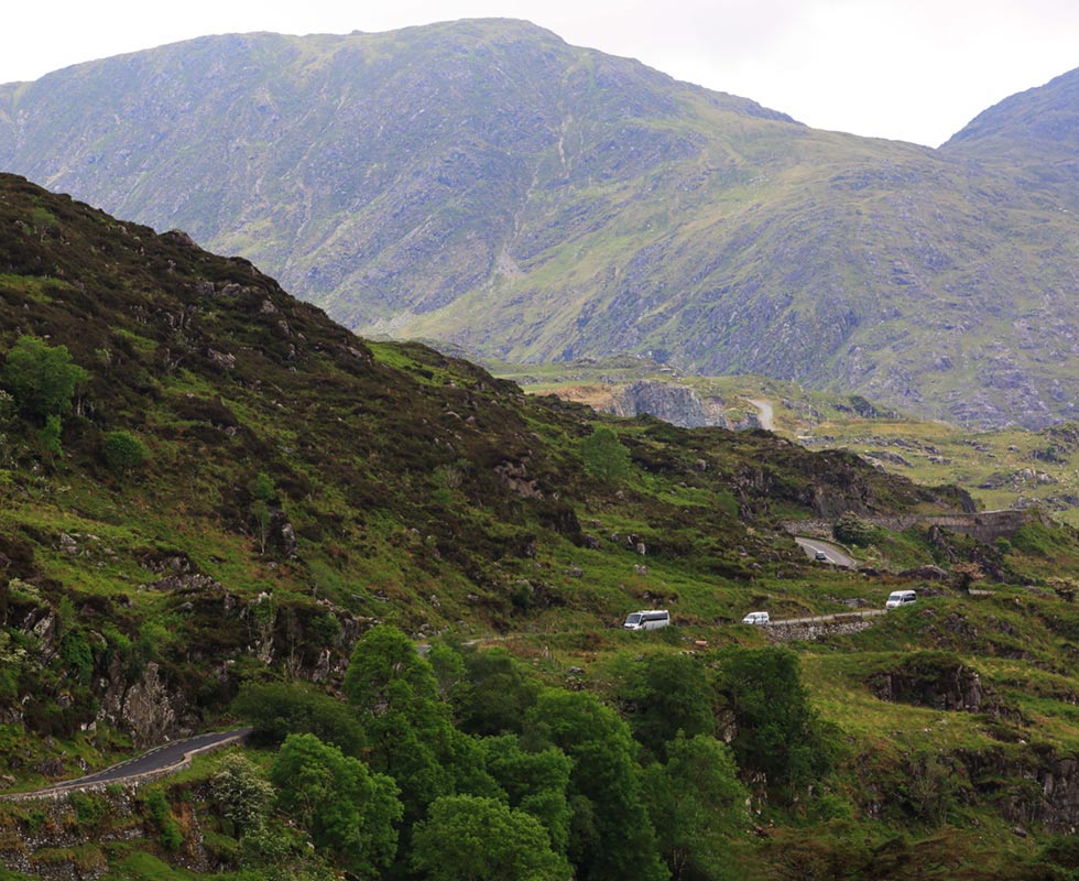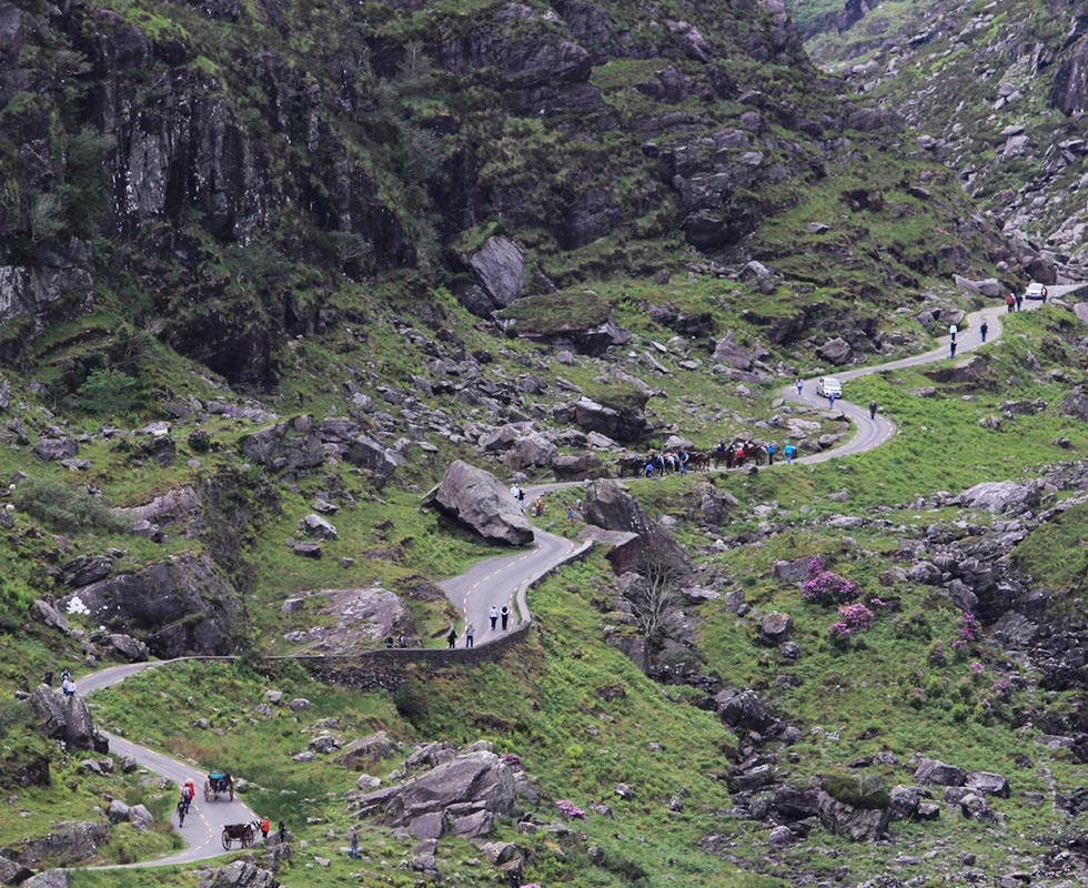 킬라니를 기점으로 시작하는 링 오브 케리는 국립공원을 통과하고 이베라 반도(Iveragh Penninsula)의 해안을 따라서 돌아오는 순환도로다. 두말할 필요 없이 아일랜드 최고의 드라이브 루트이며, 운전 자체의 재미와 극적인 자연이 어우러지는 작품이라 할 수 있다. 몰스 갑과 갑 오브 던로(Gap of Dunloe)처럼 전국적인 명소는 그 일부에 불과하다. 링 오브 케리는 산과 평원, 해안을 절묘하게 파고들어 운전자에게 평생 잊지 못할 순간을 연달아 선사한다. 길가의 수목을 스치듯 달리다가 가슴이 뻥 뚫리는 북대서양의 한복판으로 이어지고, 간혹 시골 마을 트랙터의 꽁무니를 맞닥뜨리면 시속 15킬로미터 속도로 운전하며 인내심을 시험할 수도 있다. 링 오브 케리를 달리기 전에는 다음을 숙지하자. 아일랜드의 시골에는 신작로가 거의 없다는 것을. 숱한 세월 말과 수레, 사람과 마차가 다니던 길이 그대로 차도가 되었다. 도로 폭은 어처구니없이 좁고, 모든 마을이라는 마을은 다 통과하며, 지루할 틈 없이 커브가 등장한다.