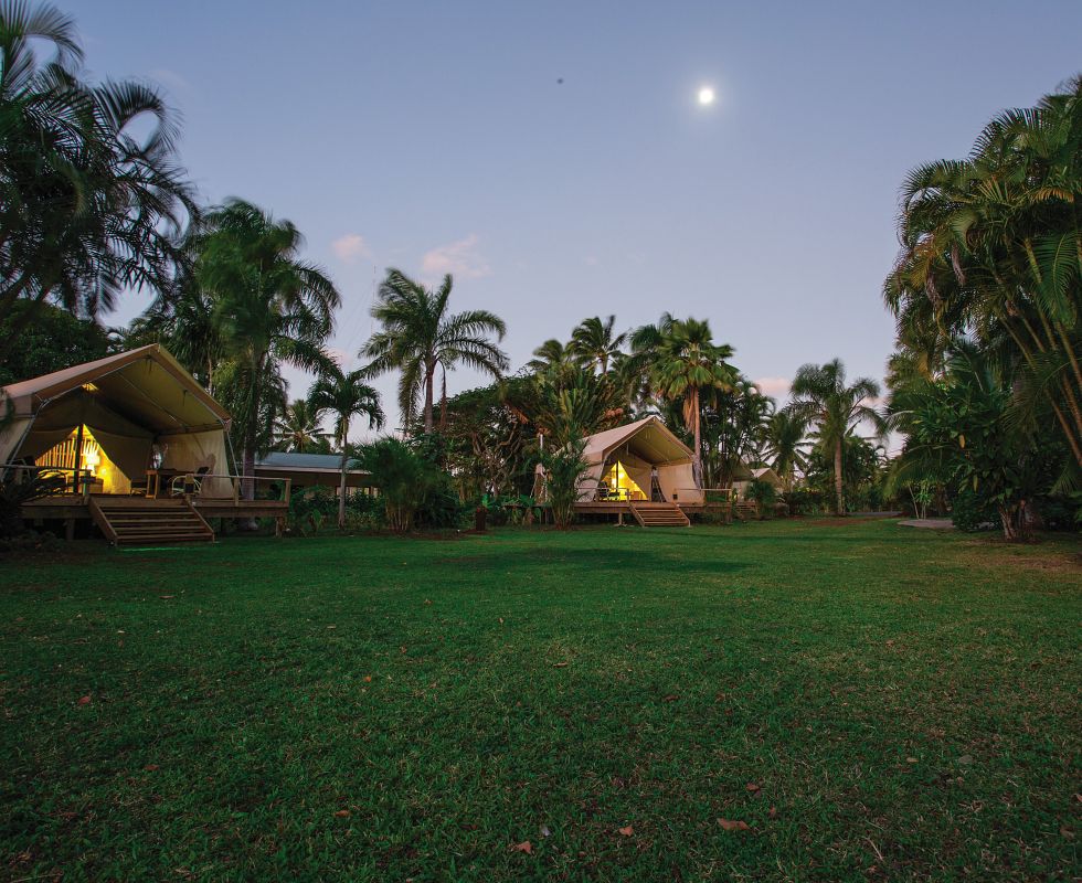 쿡 제도 라로통가(Rarotonga)섬의 이쿠랑기 에코 리트리트는 열대 정원 속 친환경 글램핑을 테마로 내세운다. 이쿠랑기는 현지어로 ‘하늘의 꼬리’를 뜻하며, 공유 · 보존 · 존중 · 환대의 쿡 제도 전통 문화가 리조트 운영의 핵심을 이룬다.