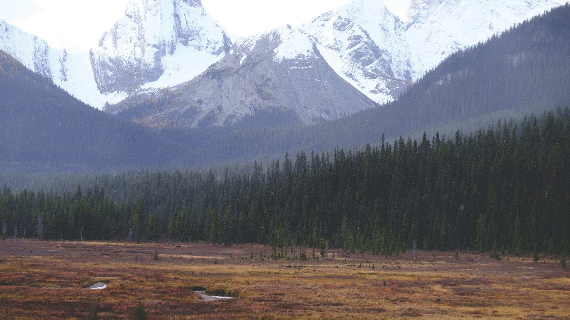 물길은 잿빛을 머금고 초지는 황갈색을 띠고 있다. 그 뒤를 가로막은 날 선 봉우리들은 강풍이 바위를 할퀴고 간 상흔 같다. 물길은 평원과, 평원은 산과 구분되고, 산은 해발 2,500미터의 수목 한계선을 따라 숲과 바위의 경계가 확실히 구분되어 짙은 풍경의 층이 나뉜다. 두 눈으로도, 카메라 렌즈로도 자연의 각기 다른 장면을 온전히 담아내기란 불가능하다. 그간의 로키산맥이 애써 숨겨놓은 듯한 자연의 속살인가. 보는 사람을 초라하게 만드는 힘이 느껴진다.