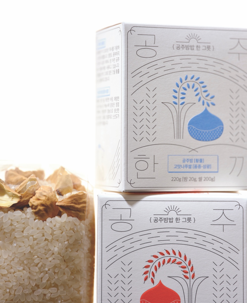 토종 곡물의 가능성을 탐구하는 곡물 경험 브랜드 곡물집集은 공주에서 그로서리 카페를 운영하며 다양한 식경험을 제안 한다. 최근 출시한 공주밤밥 한 그릇 ‘공주 한 끼’는 공주의 대표 특산물인 밤을 공주의 역사와 현재를 담고 있는 쌀과 함께 경험할 수 있는 제품. 말린 황률에 각각 100여 년 전부터 공주 일대에서 재배해온 토종 버들벼 품종 쌀, 현재 공주 지역의 대표 품종인 고맛나루쌀을 더해 두 가지 에디션으로 구성했다. 버들벼는 쌀이 단단하고 찰기가 많아 달고 구수한 맛이 나며, 삼광벼 품종의 고맛나루쌀은 ‘삼광’이라는 이름처럼 벼와 쌀과 밥에서 빛이 나는 것이 특징이다.