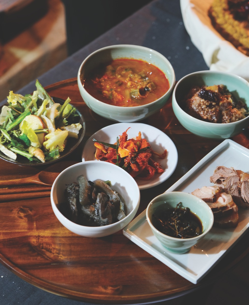마을맛여행의 하이라이트인 수곡리 ‘외갓집 밥상’ 저녁 식사는 현(現) 주병수 이장 댁에 차려진다. 이장님의 부인, 그러니까 붉으실 마을 임종순 부녀 회장님이 여기 출신이다. 외갓집 밥상은 전식부터 모두 제천에서 난 식자재로 마을 주민이 조리해 내는 게 특징. 붉으실 마을의 대표 곡물 중 하나인 수수가 전식의 주인공이다. 호스트와 게스트가 모여 수수부꾸미를 직접 부치고, 수수막걸리를 곁들여 마신다. 찹쌀을 섞은 수수부꾸미는 찰지고 구수하며, 잔칫날에 낸다는 메수수 막걸리는 달짝지근하고 새콤하다. 부꾸미를 서너 개 집어먹고 나서야 메인 밥상의 드라마틱한 내력을 듣는다. 호랑이 양대 콩 수수밥, 시래기 새뱅이(민물새우) 국, 고들빼기 샐러드, 명주실 돼지고기 수육, 더덕 김치, 잡버섯(야생 버섯)과 박 볶음, 산초 간장. 각 메뉴마다 식자재가 어디에서 오고 집에서 어떻게 만들어 먹는지 이야기가 얽혀 있다. 그렇게 소반에 차린 건강한 한끼는 풍성하지 않을 수 없으니, 땅의 기운과 마을의 정이 오롯이 입안으로 들어간다. 오랜만에 혀를 깨우는 자연의 맛을 또 언제 먹을 수 있을지. 어느새 마당에는 모닥불이 드세게 타오르고 군고구마와 머루 와인을 담은 후식이 기다린다.