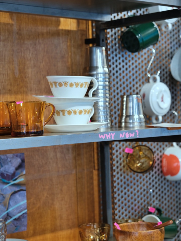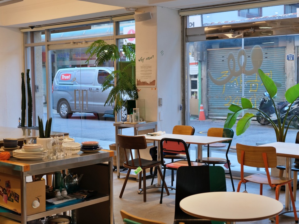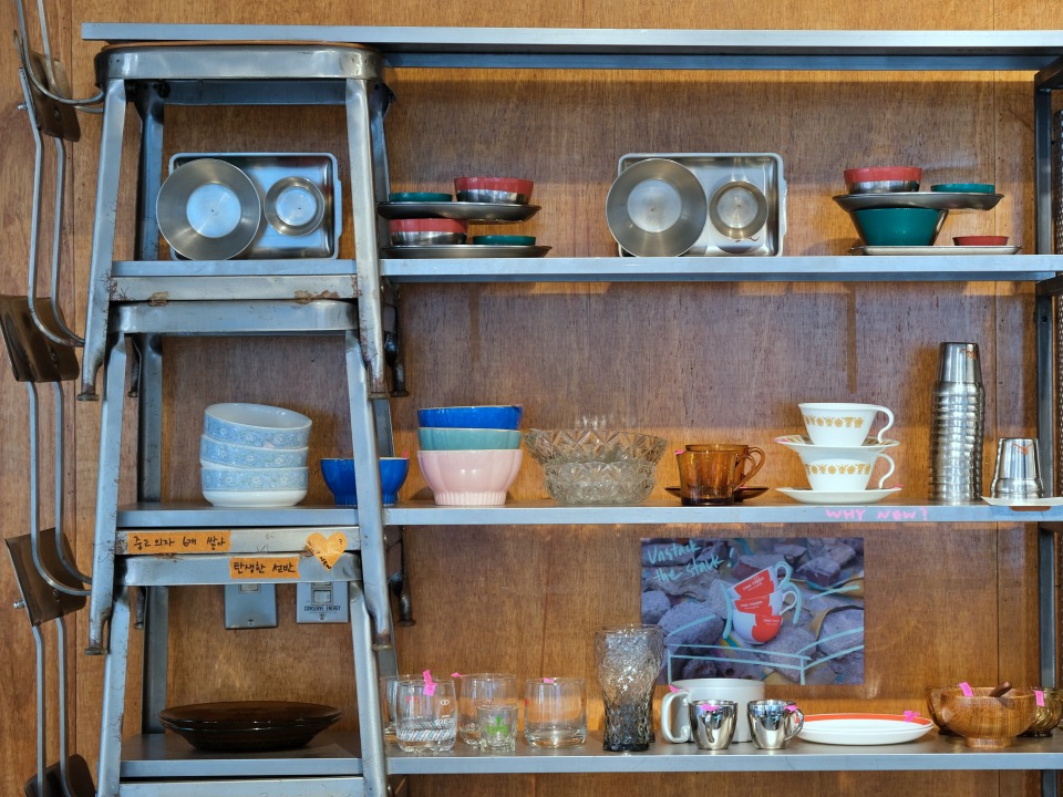 공간의 크기. 탁 트이고 유리가 통창인 공간에서 제가 셀렉한 가구나 그릇, 식기류가 매력적으로 보일 거라고 생각했어요. 그리고 최대한 인테리어를 하지 않을 것. 공간을 꾸미면서도 탄소 배출을 줄이고 싶었거든요. 여기서 새 제품은 에스프레소 머신 하나밖에 없어요. 선반은 중고 철제 의자를 겹겹이 쌓아 올려 만들었는데요. 옆, 옆집에 있는 ‘동일금속' 사장님이 제 머릿 속 상상을 구현해줬죠.
