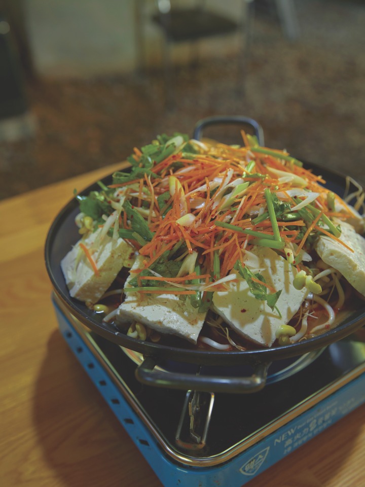 월악산 영봉을 포함해 수많은 봉우리가 파노라마처럼 펼쳐진 곳에 자리한 시골 식당에 도착했다. 천막이 있는 야외에서 두부전골을 보글보글 끓여 먹는 옛날할머니손두부다. 여행을 좋아하던 부부가 청풍명월의 풍경에 반해 터를 잡고 1995년부터 운영하기 시작했다. 옛날 할머니가 해주던 두부 맛의 기억을 살려 두부 요리 하나만으로 이 자리를 지켜온 것. 월악산에서 재배한 콩을 갈아 염전에서 가져온 간수로 손두부를 만들고 당근과 미나리, 콩나물, 버섯 등으로 향과 식감을 더했다. 찰현미, 매현미, 서리태, 흑미, 쌀 등을 넣은 오곡밥은 이들 부부의 크나큰 자랑. 옆에서 어떻게 먹어야 더 맛있다고 일러주는 운영자 부부의 따뜻한 인심은 덤이다. 산과 두부 요리는 누가 처음 발견한 조합일지 갑자기 궁금해질 만큼 맛있고 즐거운 한 끼다.