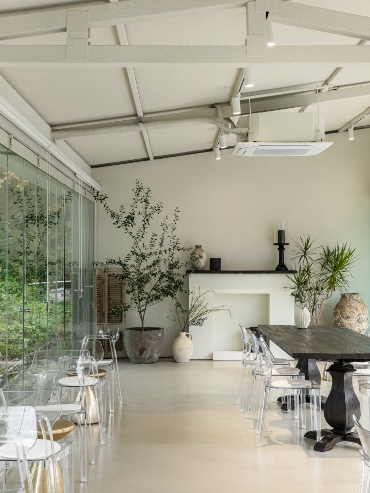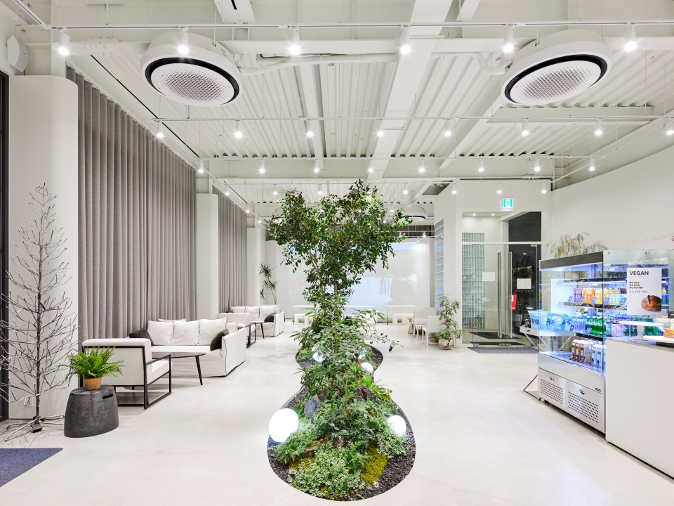 어반런드렛의 핵심 가치는 ‘Keep Clean, Green’에서 시작됐는데요. 이 철학을 공간에 적용해보니 친환경 세탁소, 건강한 마실 거리와 먹거리를 제공하는 카페 그리고 환경을 생각하는 전기차 충전소가 떠오르더라고요. 세 가지 기능을 한 공간에 결합하면 되겠다는 생각이 들었죠. 단순히 서비스를 파는 곳이 아니라 브랜드 철학을 경험하는 공간이 되길 바랬어요. 어쩌면 이 세 가지가 어반런드렛 더 테라스에 필연적 요소였을지도 모르죠.