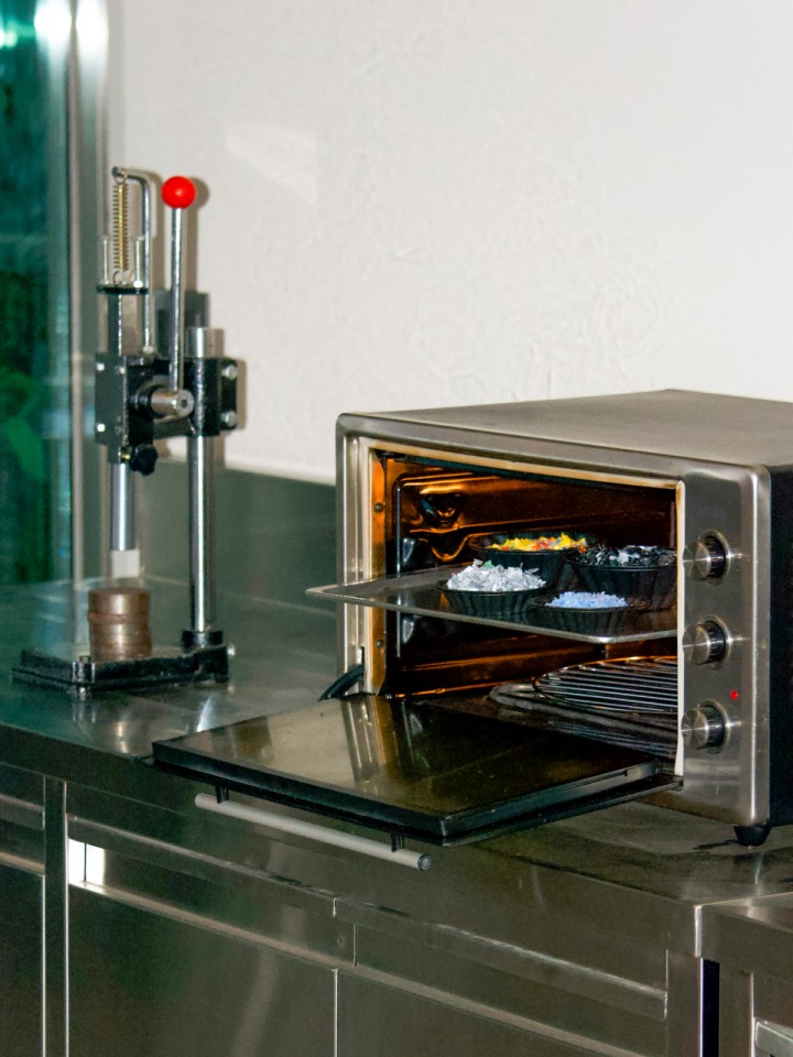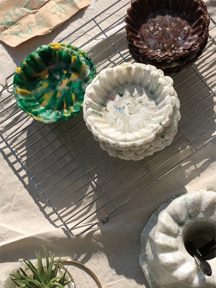 주어진 상황에 맞추다 보니 그렇게 됐네요. 원래 플라스틱을 녹일 때 사용하는 사출기가 꽤 비싸거든요. 당시 함께 일하던 친구가 오븐을 갖고 있었어요. 그걸로 플라스틱을 녹이고, 베이킹틀로 모양을 내봤어요. 철로 만든 데다 코팅까지 되어 있으니 녹인 플라스틱으로 모양을 내기에 더없이 좋은 도구였죠. 여담인데, 친구와 오래 일하고 싶어 베이킹 쪽으로 접근한 것도 있어요. 요리를 좋아하는 친구의 관심을 유도하기 위해 미끼를 던진 거죠.(웃음) 콘셉트는 자연스럽게 정해졌지만, 확신은 있었어요. 플라스틱을 다룰 수 있는 최적의 타이밍은 지금이다, 라는.