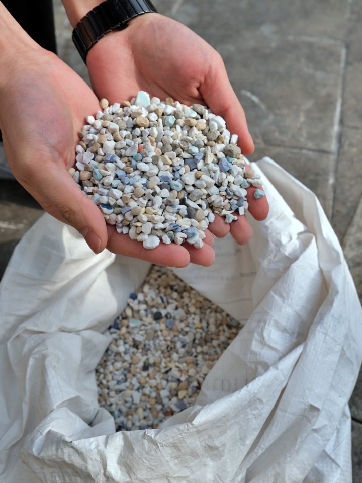 안 학교에 다니면서 작업하다 망치거나 바자회 행사에서 팔지 못하고 남은 도자기를 수없이 봐왔어요. 버려진 도자기는 한데 모아 깨부순 뒤 폐기하죠. 그런 일을 반복해서 접하다 보니 죄책감이 들더라고요. 흙은 일정 온도 이상에서 구우면 타거나 썩지 않고 오히려 단단해지거든요. 동기들끼리 우스갯소리로 ‘도예는 영원히 안 썩는 쓰레기를 계속 만드는 작업’이라고 얘기하곤 했어요. 한해 학부에서 소비하는 흙이 7~8톤 정도 되는데, 그게 다 제품이 되지는 않거든요. 버리는 비율을 최소 10~20퍼센트로 잡아도 매년 1톤은 무조건 쓰레기가 되는 거잖아요. 문득 버리는 도자기도 좋은 재료가 될 수 있을 거란 생각이 들더라고요.