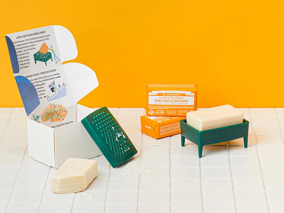 유기농 스킨&보디 케어 브랜드 닥터 브로너스(Dr. Bronner’s)는 신박한 아이디어로 이 문제를 해결했다. 해양환경보호 단체 시셰퍼드 글로벌(Sea Shepherd Global)과 함께 폐그물을 재활용해 만든 솝 디시 겸 그레이터 ‘오션 버블 버디’를 출시한 것. 네덜란드 디자이너 푸크예 플뢰르(Foekje Fleur)와 협업해 탄생한 제품의 용도는 크게 두 가지. 욕실에서는 멋드러진 비누 받침대로 사용하다가, 비누를 소분해야 할 때 치즈 그라인더처럼 그레이터로 활용할 수 있다. 그레이터로 필요한 만큼 갈아낸 비누는 틴케이스에 담으면 간편하게 휴대할 수 있을 뿐 아니라, 물에 풀어 반신욕이나 족욕할 때 사용해도 된다. 해양 오염의 가장 큰 원인인 폐그물과 플라스틱 쓰레기를 잘게 분쇄하고 깨끗이 세척한 다음 녹여 만들었다니, 더욱 의미 있지 않은가! 제품이 짙은 초록색을 띄는 것 역시 바로 그 때문이라고.