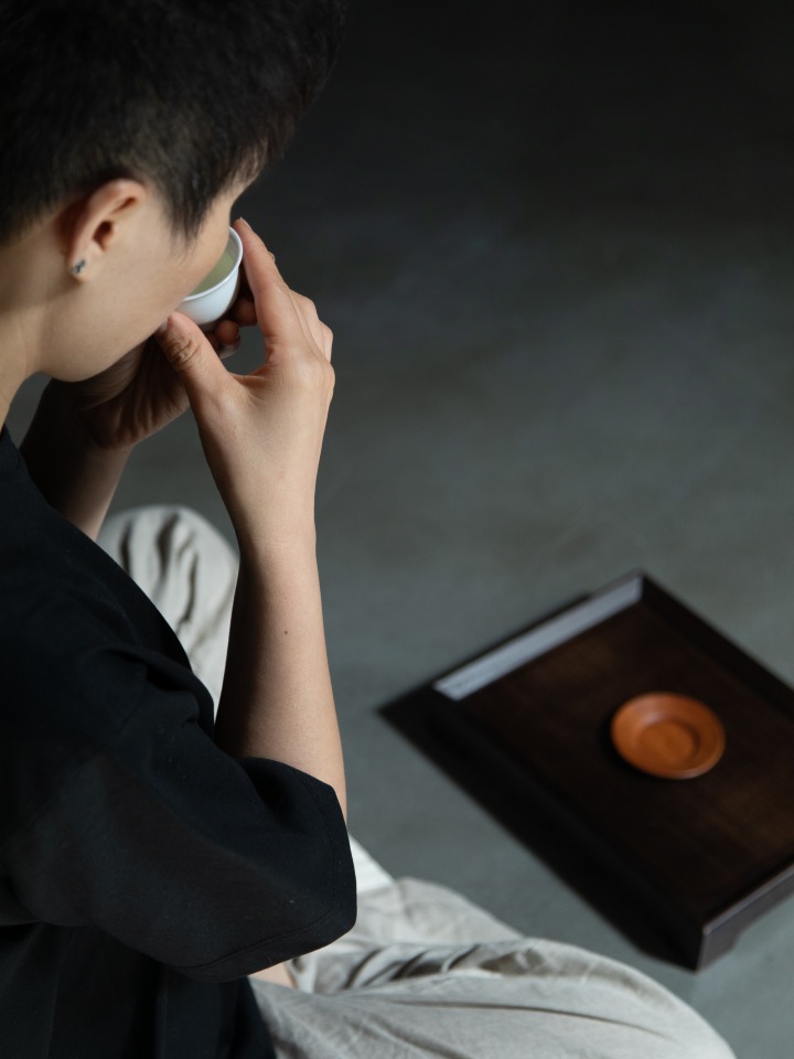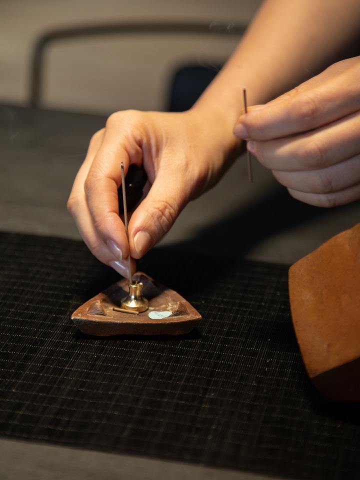금강 스님의 말을 따라 숨을 크게 들이쉬었다. 갤러리일지에서 운영하는 향 브랜드 일지인센스의 침향이 타면서 금세 공간을 가득 메운 향이 코끝을 간질였다. 침향은 침향나무에 난 상처 사이로 분비된 3 수지가 뭉쳐진 것을 말한다. 침향은 오래 전부터 기력을 회복하는 데 사용해온 약재이자 부처에게 바치는 최고의 향으로 여겨진다. 삼국사기에 왕실에서만 사용했다는 기록이 있을 만큼 부와 권력의 상징이기도 했다. 일지인센스는 깊은 삼림 속 침향을 채취해 돌절구에 찧고 대나무체로 부드럽게 거른 후, 야생 꿀을 넣어 수년간 향이 축적되는 시간을 기다린다. 그렇게 완성된 침향이 3분간 공기 중을 떠돌았다.“숨을 들이쉬며 주변에 맴도는 향의 기운을 알아차립니다."