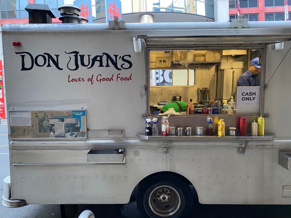 토론토 다운타운 한복판에서 맛있고 저렴한 로컬 음식을 잽싸고 배불리 먹고 싶다면, 여기로 가라. 돈 후안스 푸드 트럭(Don Juan’s Food Truck). 메트로 토론토 컨벤션 센터 바로 앞에 서 있다. 일단 위치가 정말 기막히다. 각종 국제 행사를 여는 컨벤션 센터와 CN 타워, 토론토 유니언 기차역, 로저스 센터 야구장, 대형 호텔들 사이에 딱 자리 잡고 있다. 조금만 걸어가면 하버 프론트 공원이다. 토론토를 여행할 때, 안 갈수 없는 곳이다. 맛도 기막히다. 양도 많고 저렴하기까지. 핫도그와 감자튀김 콤보가 8캐나다달러인데, 성인 1명이 배부르게 먹는다(2022년 기준). 소시지도 감자도 큼직하다. 그릴 햄버거 8달러, 푸틴 작은 사이즈는 8달러, 역시 푸짐하고 이 일대에서 가장 저렴한 식사다. 길 건너 카페에서 샌드위치에 음료 하나 추가하면 15달러 정도는 줘야 한단 말이다. 돈 후안스 푸드 트럭의 구글 평점은 4.9점. 현금만 받는다. 콤보 하나에 캔 음료(2달러) 추가한 후 하버 프론트 공원으로 가서 먹자. 강변 벤치에 자리가 많다.