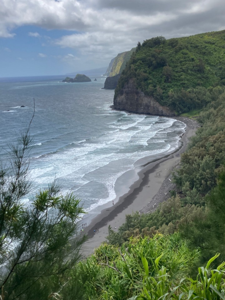 흔히 ‘빅아일랜드’라 부르는 하와이 아일랜드에서 하와이 화산 국립공원이나 마우나케아 천문대가 아니라 폴룰루 밸리(Pololū Valley)를 찾는다고요? 그렇다면, 당신은 하와이 아일랜드를 적어도 한 번 이상 방문했거나 여유 있는 일정으로 하와이에 머무는 여행자일 확률이 높다. 폴룰루 밸리는 섬 북동쪽 끝자락에 위치한 숨은 하이킹 명소다. 절벽 위 전망대에서 산길을 따라 검은모래해변까지 짧은 하이킹을 즐길 수 있다. 길이 상당히 가파르고 바위와 굵은 나무 뿌리가 많아, 내리막이라고 만만하게 보고 까불다간 다치기 십상. 샌들이나 밑창이 얇은 운동화를 신었다면 발바닥이 아플 수도 있다. 굳이 뭔가 챙겨가고 싶다면 물놀이용 샌들과 접이식 의자를 추천한다. 파도가 거세기 때문에 물놀이에는 적합하지 않은 해변이다. 대신 맨발로 검은모래 위를 걷거나 의자에 앉아 멍때리기에 좋다. 아이들이나 반려견과 함께 찾는 이들도 많다(실제로 하이킹용 유아 캐리어를 짊어지고 내려가는 이들을 여럿 보았고, 겅중겅중 뛰어다니며 즐거워 어쩔 줄 몰라하는 강아지도 만났다). SNS용 사진 촬영이 목적이라면 전망대에만 있다가 돌아가도 괜찮다.