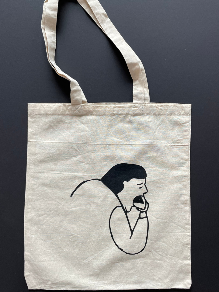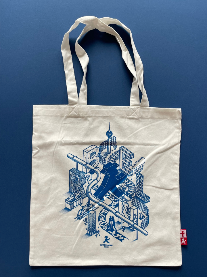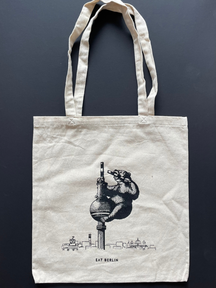 부부의 코멘트 : "베를린을 상징하는 동물인 ‘곰’이 또 다른 베를린의 상징 ‘TV 타워’를 뜯어먹는 일러스트가 그려진 에코백입니다."