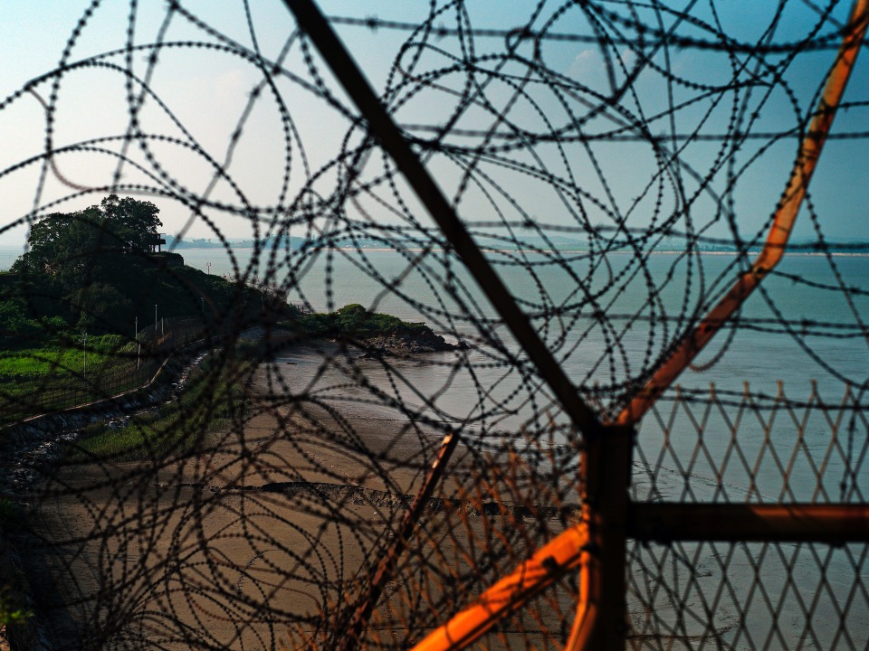 철북돈대에서 바라본 의두돈대. 철책으로 완전히 이어져 있다. 철북돈대의 전면은 인공 시설물(군이 설치한 구조물)을 설치할 때 개축된 것인지 알 수 없지만 현재는 굴곡면을 이룬다. 이곳은 여전히 전쟁이 멈추지 않았음을 표상한다.