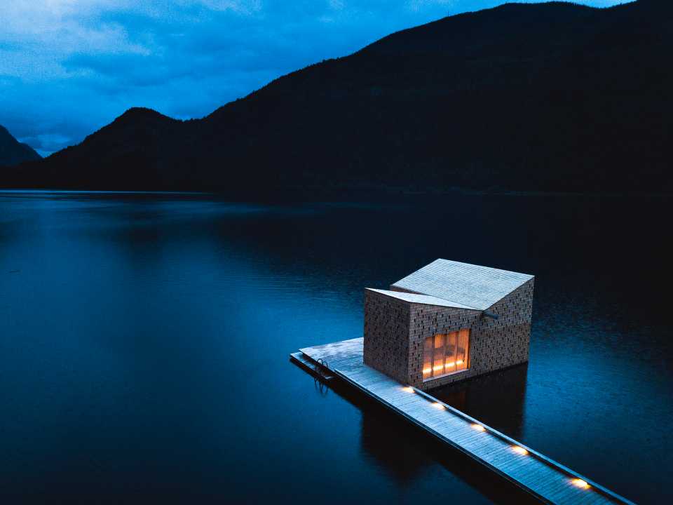 ☝🏻노르웨이 달렌(Dalen)의 반다크 호수(Lake Badak)에 떠 있는 소리아 모리아(Soria Moria) 사우나.