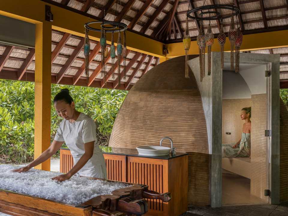 정원에서 재배한 피마자 식물, 노니, 어목, 드럼 스틱 등은 스파 관리에 활용된다. 포시즌스 리조트 몰디브 앳 란다 기라바루에서 운영하는 스파 브랜드 아유르마(AyurMa)는 리조트의 웰니스 철학을 관통한다. 고대 인도의 전통 의학 아유르베다(Ayureda), 요가 테라피, 웰니스, 지구적 복지의 네 가지 키워드를 중심으로, 개인의 몸과 마음은 물론 자연과 지구와의 조화까지 생각하는 것이 핵심(이를 위해 아유르베다 의사와 요가 테라피스트, 자연요법 치료사 등의 전문가가 상주하고 있다). 아유르베다를 바탕으로 개인의 체질을 분석한 뒤 스파 테라피, 자연요법, 침술, 요가, 명상 등의 맞춤형 웰빙 프로그램을 제시한다. 이는 리조트 내 모든 레스토랑의 메뉴판에도 적용돼 체질에 맞는 음식을 주문할 수 있도록 돕는다.