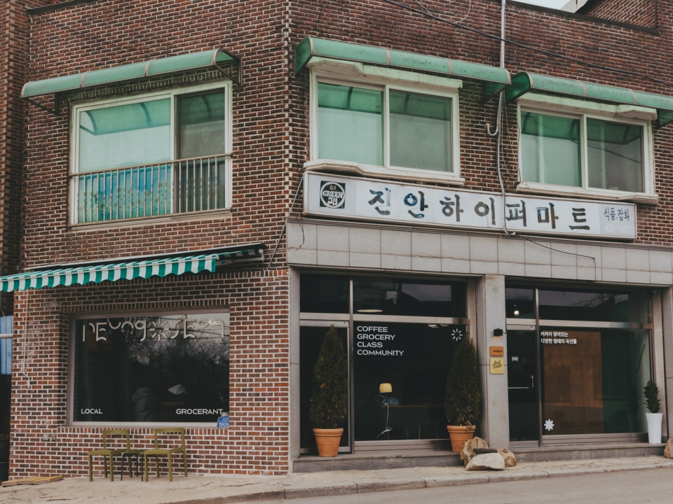(Q2)이곳에 자리 잡은 이유 그로서리 콘셉트의 카페를 열 생각으로 자리를 알아 보다가 50년 동안 마트가 있었던 이 건물을 발견했어요. 오랫동안 동네 사람들이 모이던 공간이었을 테니 저희 의도와 잘 맞는다고 생각했어요.