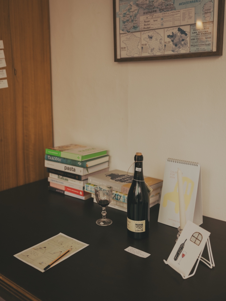 출입문과 연결된 아담한 카운터 겸 숍을 지나 식사 장소로 들어서면 겨자색 타일을 두른 오픈 키친이 반긴다. 요리하는 셰프에게 다가가 말을 걸어도 될 만큼 가까운 거리에 테이블 서너 개가 자리하고, 각종 식자재와 요리책이 놓인 선반, 여행에 관한 글과 사진이 벽면에 가득하다. 식당을 운영하면서도 한 달씩 긴 여행을 떠나곤 했을 만큼 여행을 좋아하는 박은혜 셰프의 마지막 여행지는 코로나19 전에 다녀온 이탈리아. 그런 까닭에 현재는 토마토 바질 피자, 해산물 먹물밥, 엔초비 스파게티 등 이탈리아 요리를 기반으로 한 메뉴가 주를 이루지만, 셰프가 태국 여행을 다녀 오면 태국 요리가, 일본 여행을 다녀오면 일본 요리가 메뉴에 등장할 것이다. 소로, 여행자의 집에서 원주 여행을 이어가고 싶다면, 식당을 나서기 전 카운터 벽면에 붙어 있는 여행자 지도를 살펴보자. 박은혜 셰프가 직접 그린 원주 지도로, 그녀가 추천하는 카페와 음식점 정보를 얻을 수 있다.