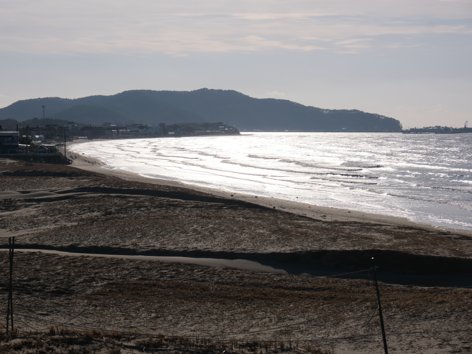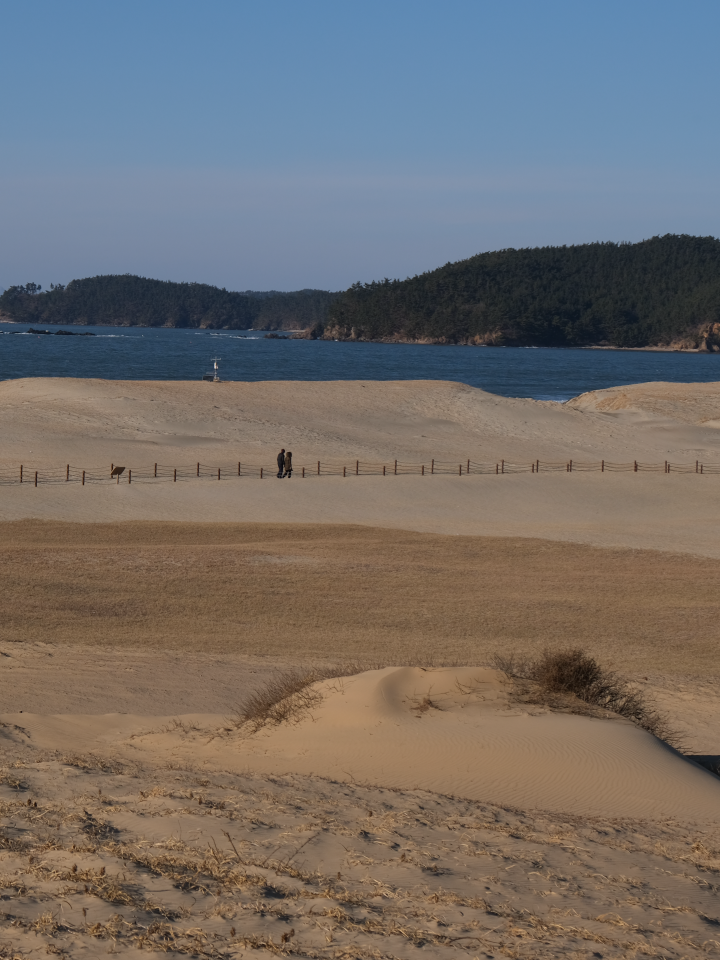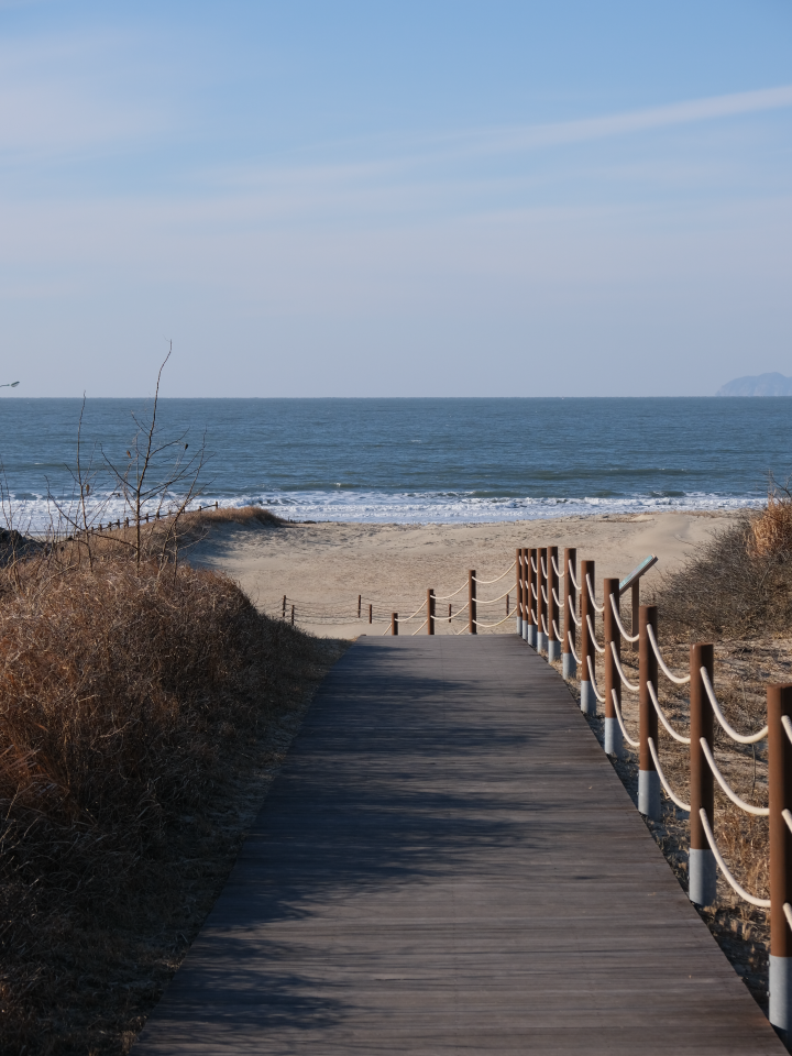 겨울인데다가 평일 오후였지만 둘레길을 따라 사구를 걷는 사람들이 여럿 보인다. 둘레길은 총 3가지 코스(A, B, C)로 나뉘는데, 길이에 따라 30~120분이 소요된다. 가장 짧은 A코스를 택한다. 미세먼지와 구름 한점 없는 파란 하늘 아래 모래 언덕이 드넓게 펼쳐져 있다. 거칠 것 없이 탁 트인 풍경이 제법 사막처럼 보인다. 산책로를 따라 언덕 위쪽에 오르니 서해 바다가 한눈에 담긴다. 그렇게 정처없이 걷는 동안 소나무숲과 갈대숲, 모래사장을 지난다. 그간 더 넓은 세상을 바라보느라 정작 가까이에 있는 아름다움을 가리고 있던 것은 아닐까 하는 생각이 든다.