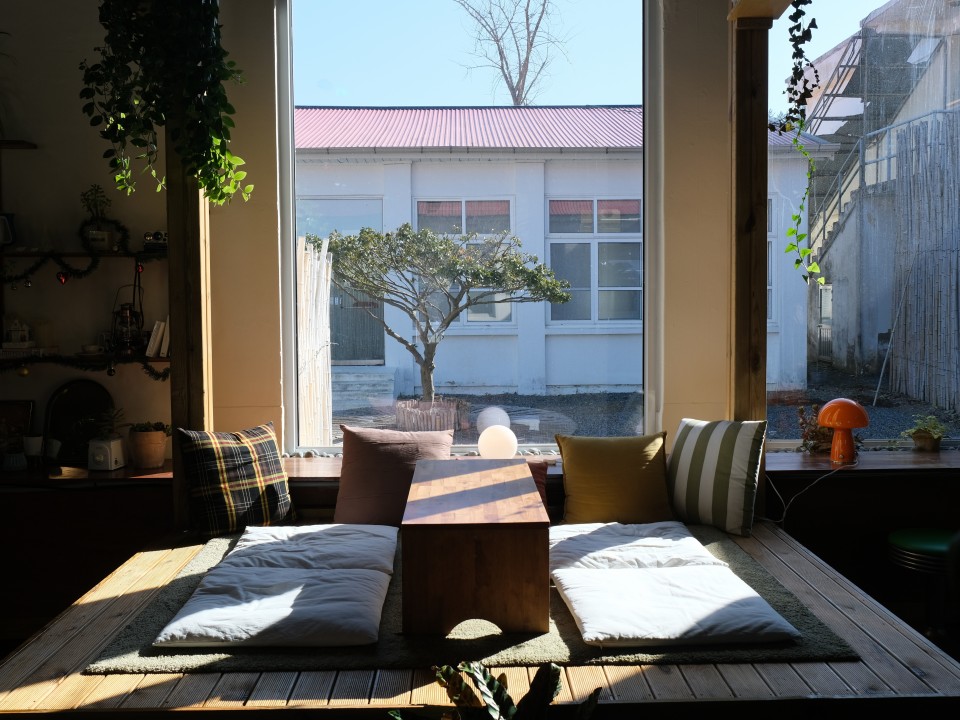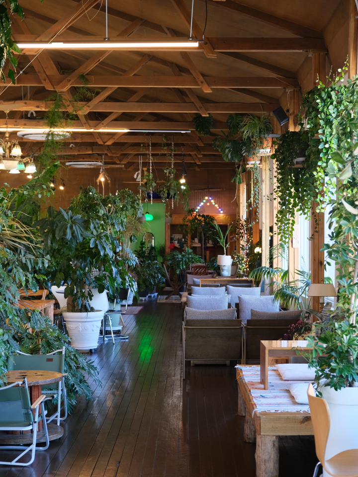빨간 지붕을 얹은 2채의 흰색 건물을 중심으로 여름이면 무성한 초목으로 뒤덮일 정원이 부지를 감싸안고 있다. 본관 건물로 들어서자 식물원을 옮겨 놓은 듯한 플랜테리어가 싱그러운 에너지를 뿜어낸다. 좌식 평상, 각기 다른 크기의 빈티지하 테이블, 햇빛을 가득 안은 창가의 바 등 규모가 큰 공간을 잘 활용해 다양한 좌석을 배치했다.