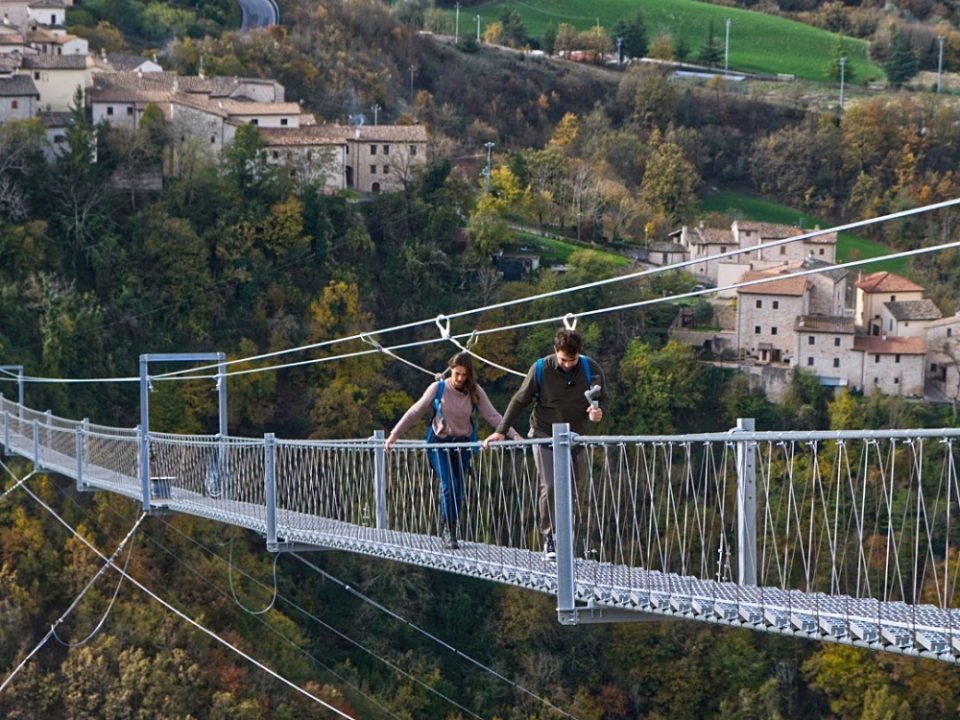 유럽에서 가장 높은 도보 전용 현수교가 지난 3월 공식 개통했다. 위치는 이탈리아 움브리아주의 셀라노(Sellano). 움브리아의 주도 페루자에서 남동쪽으로 50여 킬로미터 떨어진 이곳은 로마 시대 이전부터 사람이 거주하던 유서 깊은 지역으로, 아페니노산맥의 비기(Vigi)강 계곡 일대에 자리한 여러 개의 작은 마을로 이루어져 있다. 역사・건축 유적 등의 볼거리 외에 산과 계곡과 둘러싸인 자연환경 덕분에 에코 투어 여행지로도 손꼽힌다. 일명 ‘티베탄 브리지(Tibetan bridge)’로 불리는 현수교의 등장으로 짜릿한 즐길 거리까지 추가된 셈. 매력적인 관광 요소를 확보해 인구 감소를 막고 지역 활성화를 꾀하려는 의도다(이 지역은 2016년 이탈리아 중부에서 발생한 지진으로 큰 피해를 입기도 했다). 높이 175미터, 길이 517미터의 이 다리는 셀라노 옛 도심을 출발해 인근 마을 폴리뇨(Foligno)와 스폴레토(Spoleto)까지 곧장 이어진다(일방 통행). 특이한 것은 도착점의 고도가 출발점보다 무려 68미터 높다는 사실. 다리 이용은 온라인 사전 예매 후 가능한데, 키 120센티미터 이상이어야 하고 안전 장치 착용이 필수다. 발 디딤판 사이에 간격이 있기 때문에 고소공포증이 있는 사람(=글쓴이)에겐 권하지 않는다.