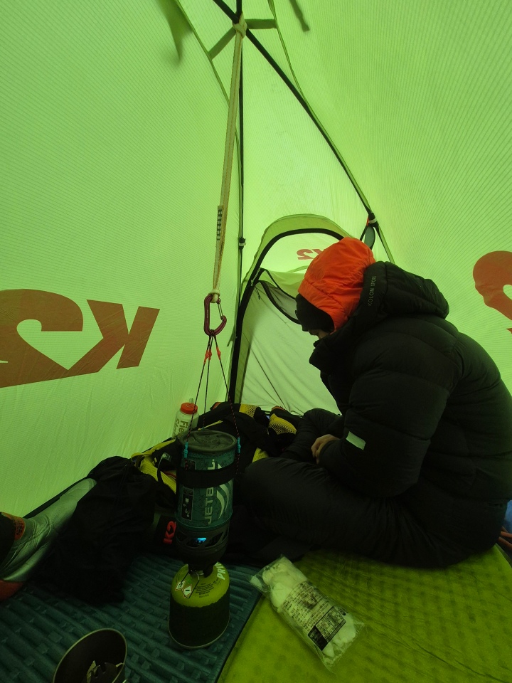 비탈면에 설치한 2인용의 작은 텐트는 체온을 유지시켜 주고 바람과 추위를 막아주는 고마운 안식처가 된다. 텐트 바닥면이 울퉁불퉁 고르지 못해서 앉거나 눕기도 불편하지만 텐트 안에 들어가 있는 것만으로도 생존의 가능성은 높아진다. 눈이 내리면 밤새 눈을 치우고 눈사태 지대를 살펴야 한다. 이런 등반의 과정은 어렵고 힘들지만, 나는 있는 그대로의 산과 마주하게 된다. 당연하다는 듯 여기에 순응하는 것이 정신적으로 산과 잘 동화될 수 있는 길이다.