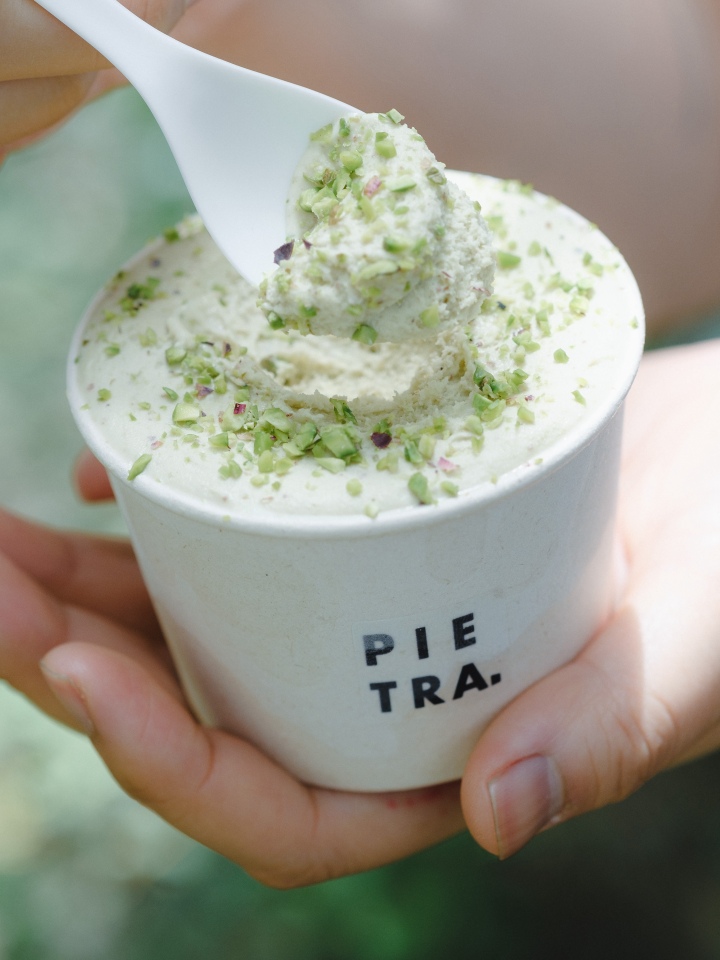 신 대표에겐 젤라토 만드는 일이 건축과 전혀 다르지 않다. 평소 아이스크림을 좋아하는 그는 ‘더 맛있는 것’을 갈구하다 젤라토 만드는 일에 몰두하게 됐다. 최상의 식자재로 만들 수 있는 아이스크림이 젤라토였던 것. 재료만 다를 뿐, 자신의 방식대로 설계하고 상상력을 펼친다는 데서 건축과 젤라토 만드는 일은 분명 닮아 있다. 그가 건물을 계약하고 1년이 지나서야 피에트라를 오픈한 건 젤라토를 향한 열정적인 학구열 때문이었다. 치열한 고민 끝에 완성한 대표 메뉴 중 하나는 브론테 피스타치오로, 시칠리아의 브론테(Bronte) 마을에서 재배한 피스타치오로 만든다. 전 세계 피스타치오 생산량의 단 1퍼센트만을 차지하는 브론테산 피스타치오는 에트나 화산의 경사면에서 오랜 시간을 견뎌내고 자란다. 그래서인지 한 스쿱의 젤라토에서 열매에 내재된 강인한 생명력과 비옥한 토양, 강렬한 햇빛의 맛이 느껴진다. 이렇게 맛 좋고 건강한 식자재를 찾다 보니 자연히 국내 농가와도 손을 맞잡게 됐다. 홍매실, 완두콩, 매화, 옥수수 등 국내 농장에서 *제철 과일과 채소를 수급해 젤라토로 변신시키고 있다.