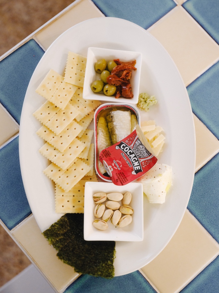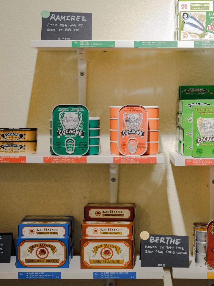 리스본 캔어리의 정체는 통조림 가게가 맞다. 호스트인 김유정 부장의 설명을 따르자면, 포르투갈의 해산물 통조림과 와인을 페어링해 맛볼 있는 곳. 포르투갈의 국민 통조림, 하미레즈(Ramirez) 통조림을 독점 수입하는 회사 노바스텔라가 운영하는 쇼룸이자 바다. 7년 전, 김 부장과 대표를 맡고 있는 남편은 통조림을 처음 수입할 때부터 고객과의 꾸준한 접점을 고민했는데, 리스본 캔어리가 그 해결책이었다. 이미 200여 회의 하미레즈 통조림 팝업 행사를 통해 호응을 확인했기 때문에 어느 정도 확신이 있었다고. 리스본의 작은 통조림 공장을 콘셉트로 시작한 작은 가게. 8명쯤 앉을 만한 바 테이블과 통조림 선반으로 소소하게 꾸몄지만 생기가 넘친다. 2022년 문을 열어 올해 2년 차인데, 벌써 입소문으로 많은 고객을 확보했다. 무엇보다 제품의 맛과 공간의 분위기가 사람들을 불러 모은 것이다.