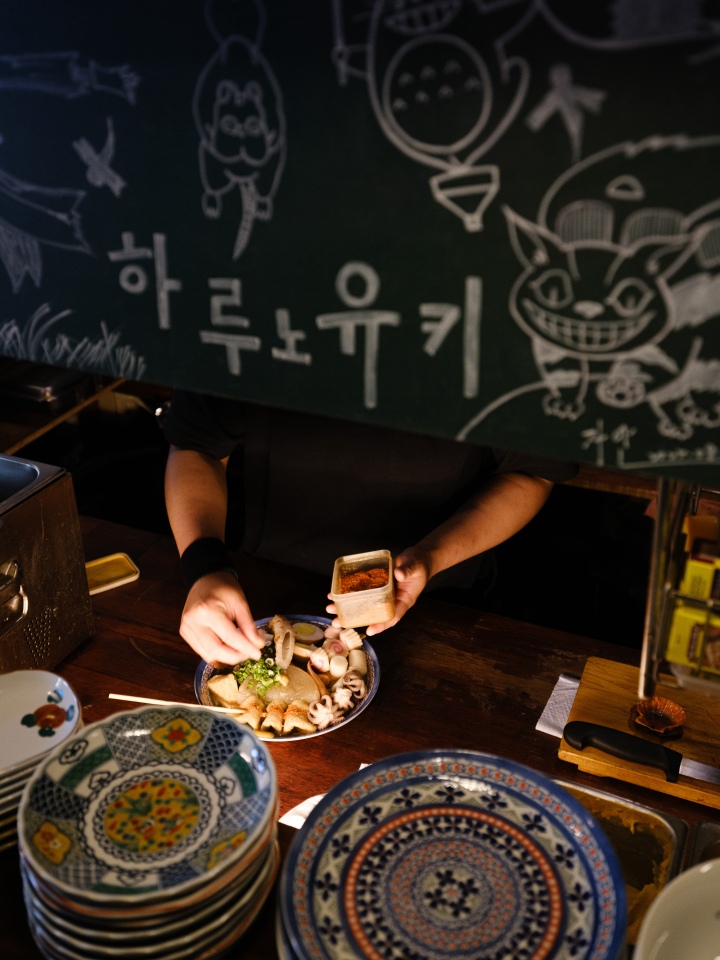 양식을 통해 요리의 세계에 빠져들었다는 이 대표. 그는 한식, 일식 등의 요식업을 차례로 경험한 후에 하루노유키를 오픈했다. 쉽게 흉내 낼 수 없는 일본 특유의 분위기에 반해 *가마쿠라 (鎌倉市) 근처에서 1년간 살며 현지 문화를 직접 경험하기도 했다. 하루노유키를 준비하면서 가마쿠라에서 자주 가던 동네 술집을 떠올렸다. 열띤 홍보나 근사한 메뉴 사진 한 장 없지만, 항상 활기차고 만석이던 가게에 대한 동경을 공간 안에 담은 것. 무엇보다 편안한 술집이 되기를 바랐다. 누구나 부담 없이 즐길 수 있는 어묵을 메인 메뉴로 선택한 것도 그래서다. 이곳의 대표 요리는 뭉근히 끓인 육수에 각종 어묵, 달걀, 가리비, 쭈꾸미, 곤약, 두부 등을 넣은 **오뎅모리아와세(盛り合わせ)다. 손님들은 특히 육수에 대해 호평한다. 미역과 가쓰오부시, 종자 간장을 오래 끓여 낸 깊은 맛이 일품이다.