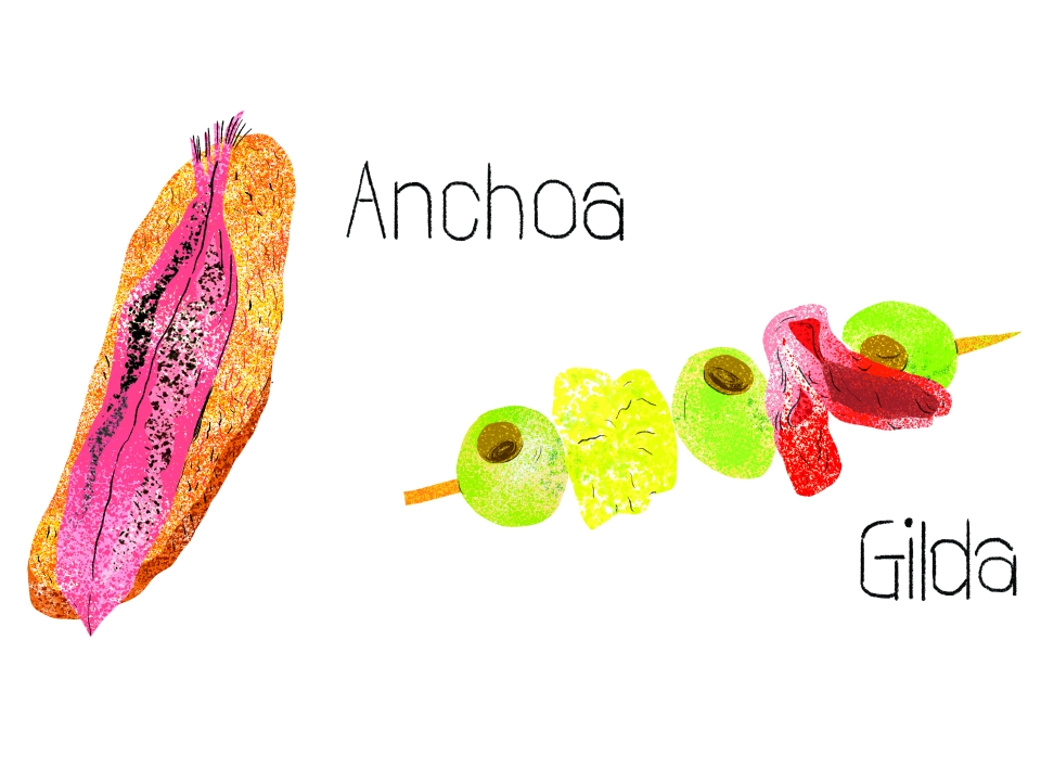이른 여름을 알리는 바스크 지역의 제철 생선은 안초아입니다. 우리네 멸치와 비슷하게 생겼는데, 크기는 살짝 큰 듯합니다. 여름에 잡은 안초아는 겨울을 지낸 녀석들이라 그런지 가을에 수확한 것보다 더욱 크고 살이 많습니다. 갓 잡았을 때는 푸른빛을 띠다가 점점 파란색으로 변하고, 상할 때쯤엔 검은색이 짙어집니다. 식초와 올리브유에 재워 생으로 먹고, 튀겨도 먹고, 구워도 먹고, 소스에 끓여서도 먹는 등 다양한 조리법이 있지만, 연중 먹을 수 있는 방법은 염장입니다. 할머니들이 한 땀 한 땀 정성 들여 발라낸 안초아의 살은 소금에 절여지고 시간이 지나면서 단단해지고 감칠맛을 얻습니다. 이것을 소금에 절인 올리브와 발효한 바스크 전통 고추인 긴디야(Guindilla)와 함께 꼬치에 꿰어 먹으면 아주 강렬한 한 방의 애피타이저가 됩니다. 짜고 시고 감칠맛 가득한 세 가지 재료가 한 입에 들어가니까요. 이 요리는 1946년 개봉한 미국의 느와르 영화 〈힐다〉에서 영화배우 리타 헤이워스(Rita Hayworth)가 연기한 마성의 여주인공 이름을 따서  힐다(Gilda)라고 부릅니다.
