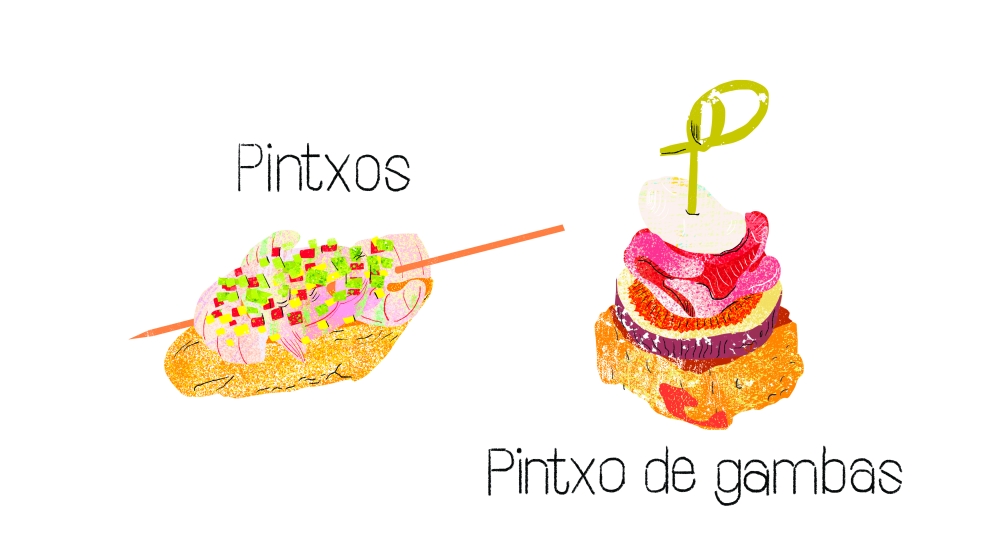 핀쵸스는 타파스의 바스크어 표현입니다. 핀쵸(Pintxo)에 꼬챙이라는 뜻이 있기에 여러 재료를 높게 쌓아 꼬치로 고정한 음식의 모양새에서 유래했을 것으로 추측합니다. 하지만 근래에 들어서는 꼬치를 끼웠든 안 끼웠든, 바스크 지역의 여느 바에서 어느 때나 즐길 수 있는 적은 양의 음식을 핀쵸스라고 통칭합니다. 때로는 재료나 조리법에 공이 더 많이 들어가는 고급 타파스를 핀쵸스라 부르기도 하고, 바스크 지역의 특색이 있는 타파스(염장 대구, 안초아, 절인 고추 등 바스크 고유의 식자재를 사용)를 핀쵸스라고 부르기도 합니다. 아무튼 이 바에서 저 바로 옮겨 다니며 타파스와 핀쵸스를 즐기고 수다를 떠는 행위가 바스크를 비롯한 스페인 전역의 전형적인 식문화이자, 스페인 사람들의 일상이라는 점은 부인할 수 없을 겁니다. 매일 오후 대여섯 시만 되면 구시가의 좁은 거리에 늘어선 스탠드 테이블에서 삼삼오오 핀쵸스와 와인을 즐기는 이들을 쉽게 볼 수 있으니 말입니다.