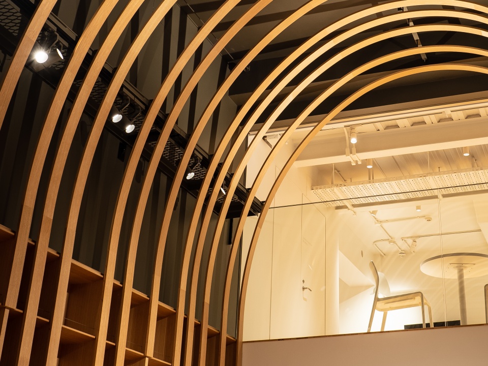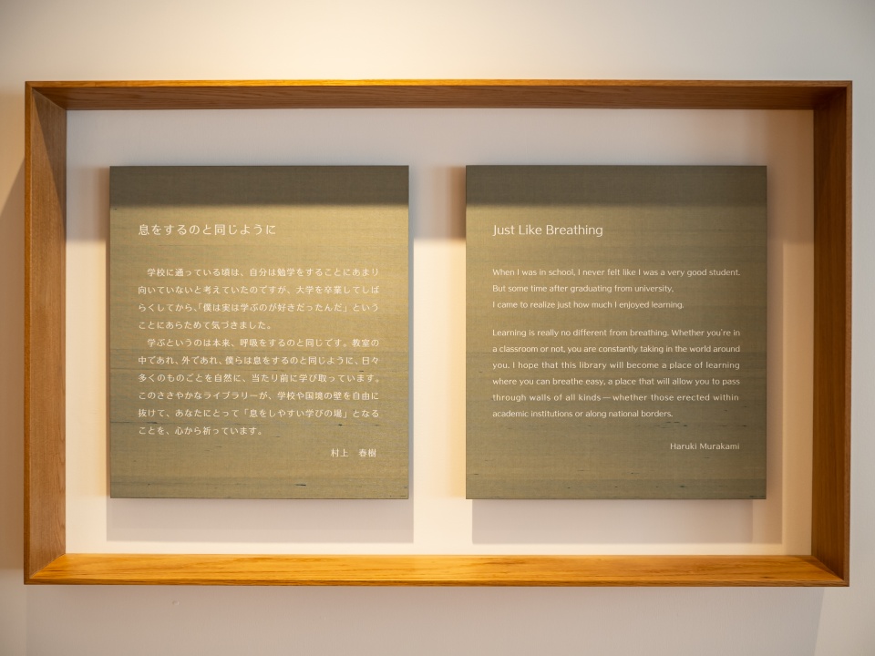 계단 양옆으로 터널을 형상화한 아치형 책장이 시선을 사로잡는다. 방문객은 계단에 자유롭게 앉아 서가에 꽂힌 책을 읽을 수 있다. 레이먼드 카버(Raymond Carver)를 비롯해 하루키가 일본어로 번역했거나 그의 문학적 뿌리가 되는 영미권 작가들의 작품도 구비돼 있다. 위층 열람실에 놓인 넓은 원목 책상에 앉아 자신만의 공부를 해도 괜찮다. “배우는 것은 마치 숨 쉬는 것과 같다.” 벽면에 걸린 액자 속 하루키의 문장처럼 말이다.