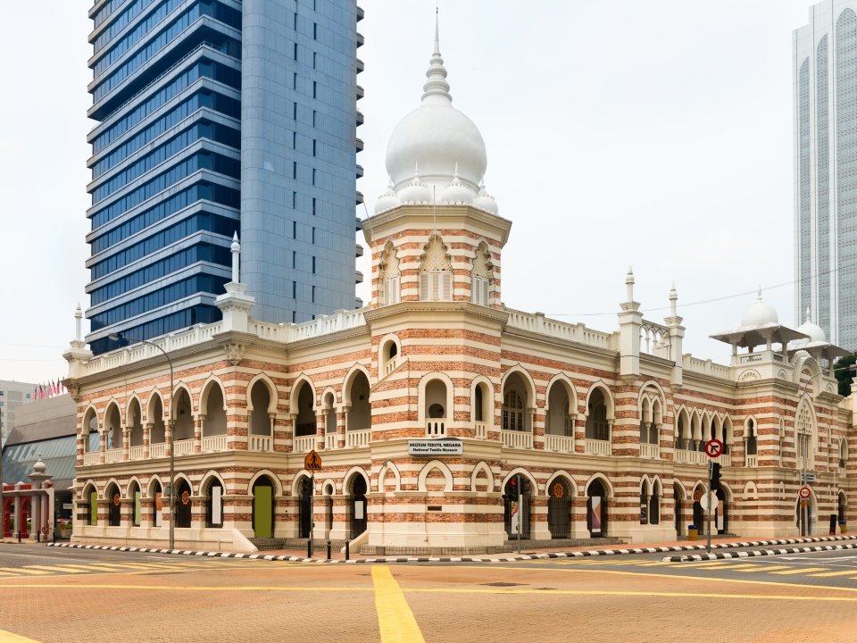 므르데카 광장(Merdeka Square)에서 도보 1분 거리의 국립 섬유박물관은 독특한 외관으로 시선을 사로잡는다. 영국 출신 건축가 아서 베니슨 허백(Arthur Benison Hubback)의 설계로 1905년에 완공된 건물은 지난 시대의 철도 본부, 은행, 법원으로 사용됐다. 그후 2010년에 이르러 말레이시아에서 발달한 섬유 문화와 역사를 보존하기 위한 섬유 박물관으로 재탄생한 것. 빨간색과 흰색 줄무늬 패턴의 건물 외벽은 인도 이슬람 건축의 영향을 받은 무어(Moorish) 양식을 보여준다. 건축물과 조명의 조화가 아름다워 쿠알라룸푸르의 야경 명소로도 잘 알려져 있다. 관람객은 총 5개로 나눠진 전시관을 통해 말레이시아의 섬유 발달 과정을 단계별로 만날 수 있다. 포혼 부디 전시실(Pohon Budi Gallery)은 선사 시대에 시작된 직물의 역사부터 무역을 통한 직물의 발전, 제조 장비, 전통 기법 등을 전시한다. 쁠랑이 전시실(Pelangi Gallery)에선 보존 염색 기법으로 만든 다양한 색상의 천을 볼 수 있다. 특히 여러 민족의 고유성을 보여주는 각양각색의 바틱이 눈길을 끈다. 떨룩 브란타이 전시실(Teluk Berantai Gallery)은 금 자수와 금박을 새긴 화려한 면직물을, 라트나 사리 전시실(Ratna Sari Gallery)은 금, 은 구리로 만든 장신구를 통해 풍부한 문화와 예술을 소개한다. 사인드라 전시실(Saindera Gallery)에선 섬유 관련 기획 전시, 토크쇼나 패션쇼 등의 행사를 진행해 여행자에게 색다른 경험을 선사한다.