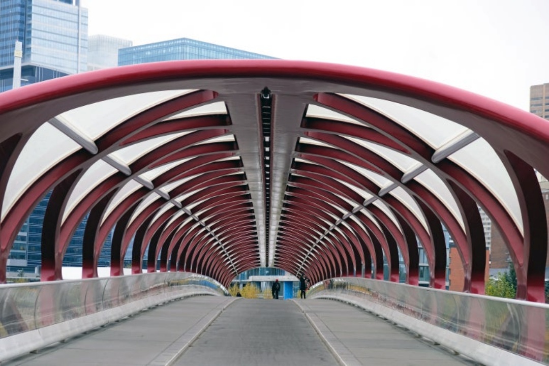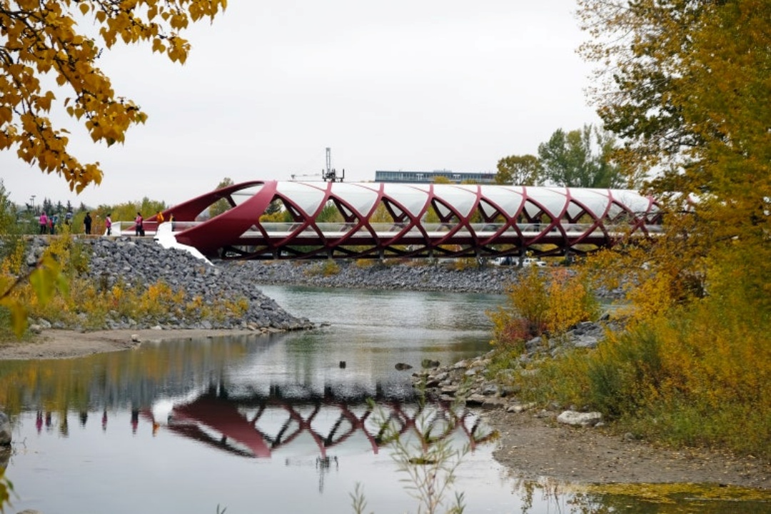 로키산맥 밴프 국립공원의 보우 빙하(Bow Glacier)에서 발원해 흐르는 보우강(Bow River)은 캘거리의 젖줄이다. 옛 서부 개척민들은 보우강과 엘보강(Elbow River)이 교차하는 지점에 무역 거점과 군사 요충지를 세웠고, 그게 바로 캘거리의 시작이었다. 오늘날 보우강 변은 시민들의 휴식처로 거듭나 사랑받고 있다. 보우강을 가로지르는 130여 미터 길이의 평화의 다리(Peace Bridge)는 이색적인 외관으로 사진가의 피사체가 되고는 한다. 강의 생태계를 보호하기 위해 교각이 없이 설계된 다리는 유선형 형태로 뻗어 있고, 캐나다 국기를 상징하는 빨간색과 흰색으로 칠해져 있다. 다리 시작점에서 정중앙으로 앵글을 잡으면, 도시와 연결되는 기하학적 디자인의 터널 같은 장면을 연출할 수 있다. 보행자 전용 다리이기 때문에 촬영 시, 위험도도 적다.