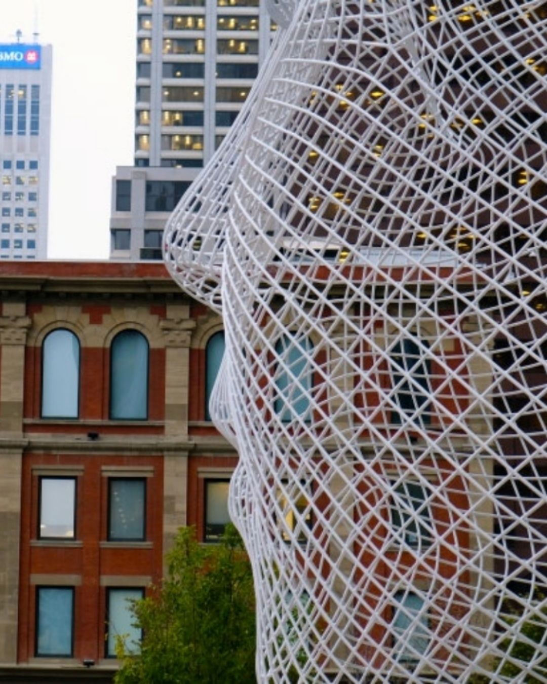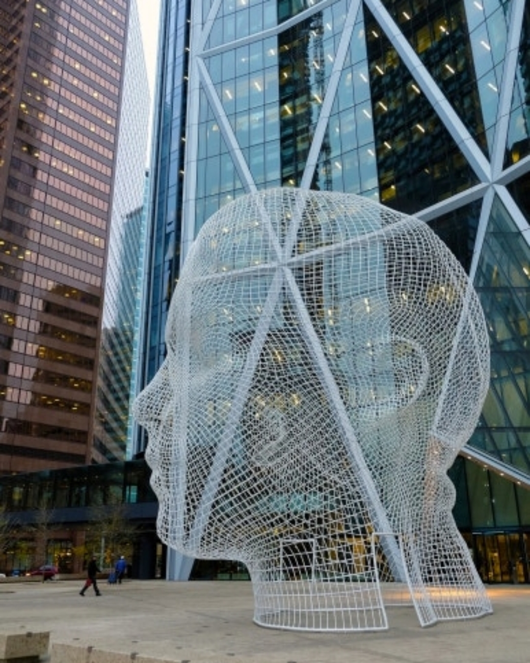 캘거리 다운타운의 랜드마크인 보우 타워(The Bow Tower) 앞 광장. 보일 듯 말 듯한 소녀의 얼굴이 지긋이 사람들을 바라보고 있다. 스페인 출신의 세계적 작가 하우메 플렌사(Jaume Plensa)의 설치 작품 다. 철제 와이어 구조로 제작된 12미터 높이의 이 조각은 작가의 창의성을 한껏 드러낸다. 보는 각도와 시간대에 따라 조금씩 다른 모습을 띠는데, 눈을 감은 형태의 얼굴의 안에 들어가서 관람자의 두 눈으로 주변을 바라볼 수 있다. 마치 소녀의 머릿속에서 캘거리라는 도시를 상상하듯 말이다. 다운타운의 빌딩과 대비되는 앵글로 작품을 촬영하면, 독특한 느낌의 장면을 완성할 수 있을 것이다. 불빛이 반사되어 더욱 아름답게 변신한다.