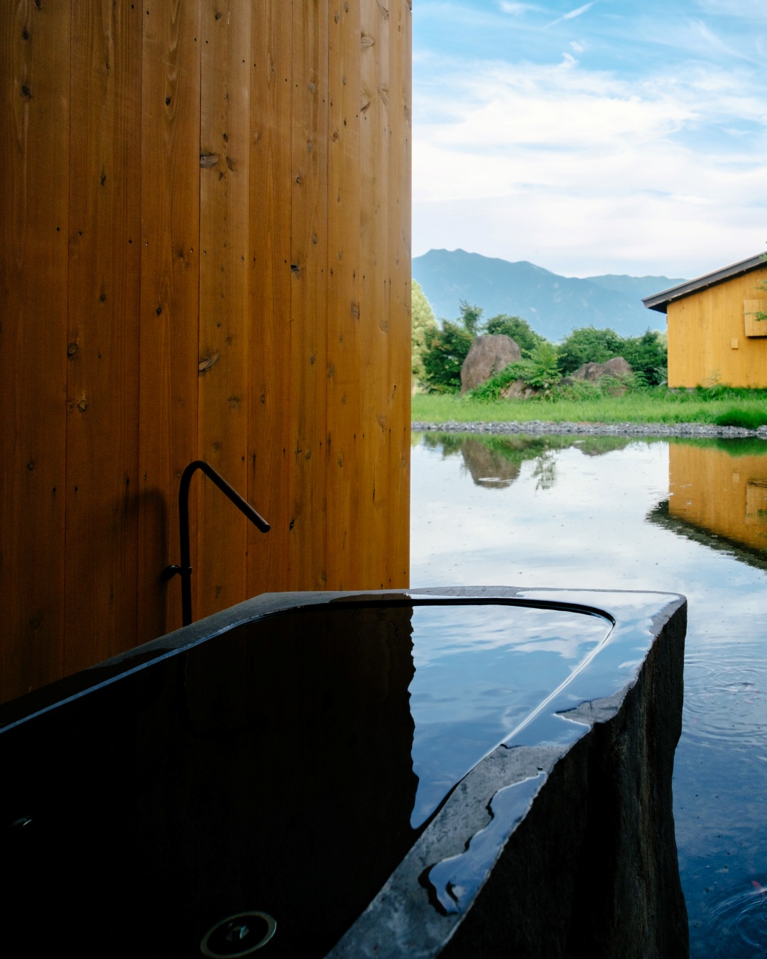느티나무 기둥과 들보를 사용한 사토야마 주조 본관 건물은 옛 가옥의 원형을 최대한 살렸다. 높은 천장을 떠받친 목조가 그대로 드러난 로비에는 이사무 노구치(Isamu Noguchi)와 핀 율(Finn Juhl) 등의 디자인 가구와 예술 작품이 손님을 환영한다. 13개의 미니멀한 객실에도 세심하게 고른 가구와 작품이 놓여 있고, 널찍한 창문을 통해 보이는 니가타의 웅장한 풍광은 한 폭의 그림 같다. 오오사와야마(大沢山)의 온천수와 삼나무 숲의 기운이 흐르는 노천탕은 일본의 전통 온천 요법인 ‘탕치(湯治)’를 현대적으로 되살린다. 사토야마 주조 객실의 또 다른 특징은 어메니티부터 가구까지 모두 판매하는 제품이라는 것. 이를 위해 료칸 내에도 편집숍을 별도로 운영하고 있다.