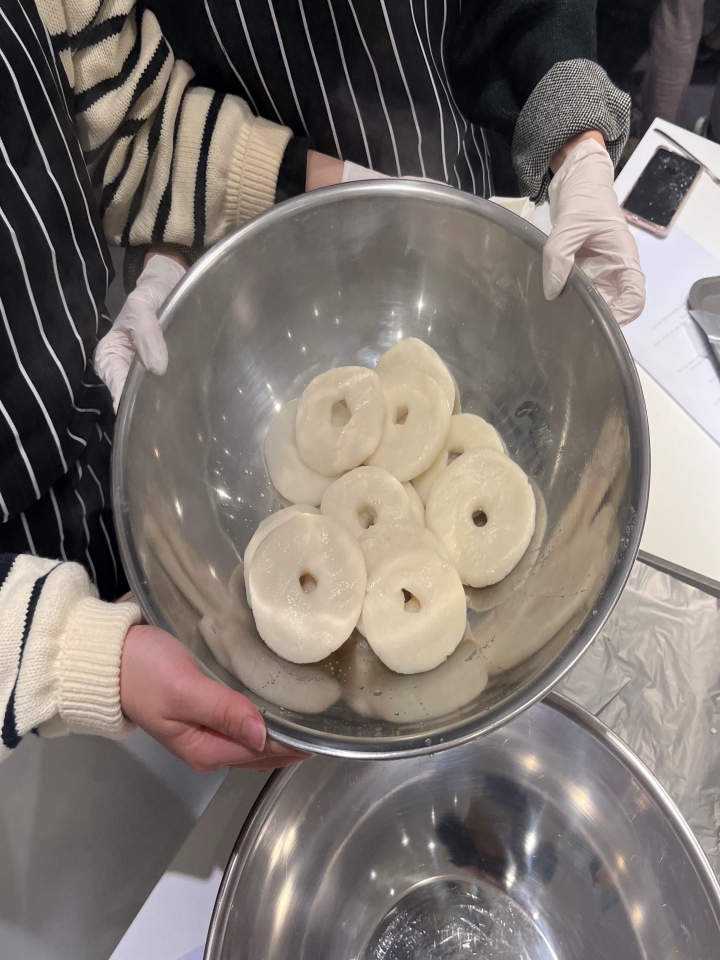 자리에 마련된 쌀가루에 뜨거운 물을 조금씩 부어서 익반죽을 할 거예요. 반죽이 잘 되었으면 반죽을 조금씩 떼어 동그랗게 만들고, 가운데를 눌러 도넛 모양의 구멍 떡을 만듭니다. 왜 이런 모양을 만드는지, 어떻게 해야 나중에 잘 익는지 우리술당당의 설명에도 귀 기울여가며 만들어보세요.
