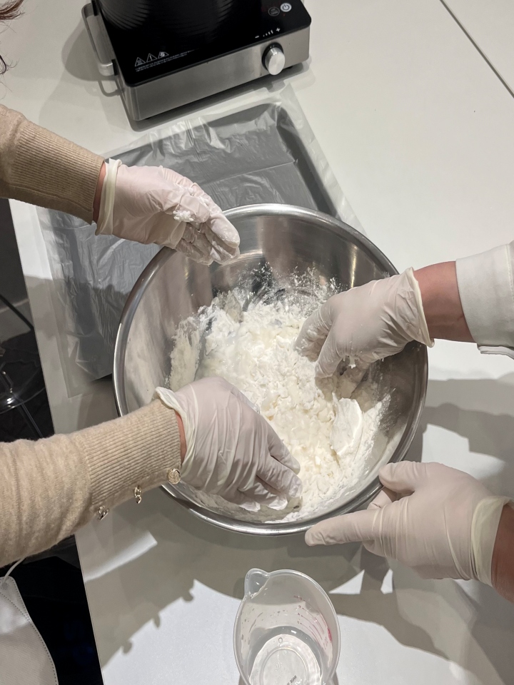 데쳐낸 떡이 식는 동안, 이화주를 다 같이 시음해봅니다. 꾸덕한 질감의 이화주는 크래커에 발라먹거나 딸기에 찍어 먹어도 맛있답니다. 이렇게 맛있는 술을 만들고 있다고 생각하니 다시 반죽할 힘이 생기는 것 같죠?