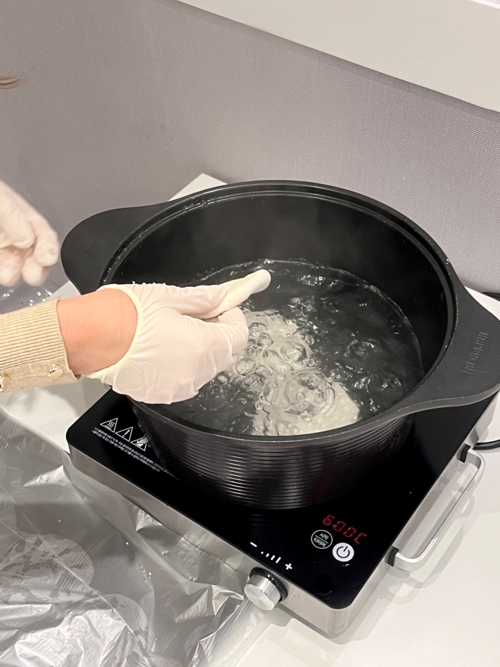 구멍떡이 잘 만들어졌다면, 끓는 물에 조심스레 넣고 데칩니다. 우리술당당 대표가 떡이 익었다고 알려주면, 그때를 놓치지 말고 잘 건져내 으깨줍니다.