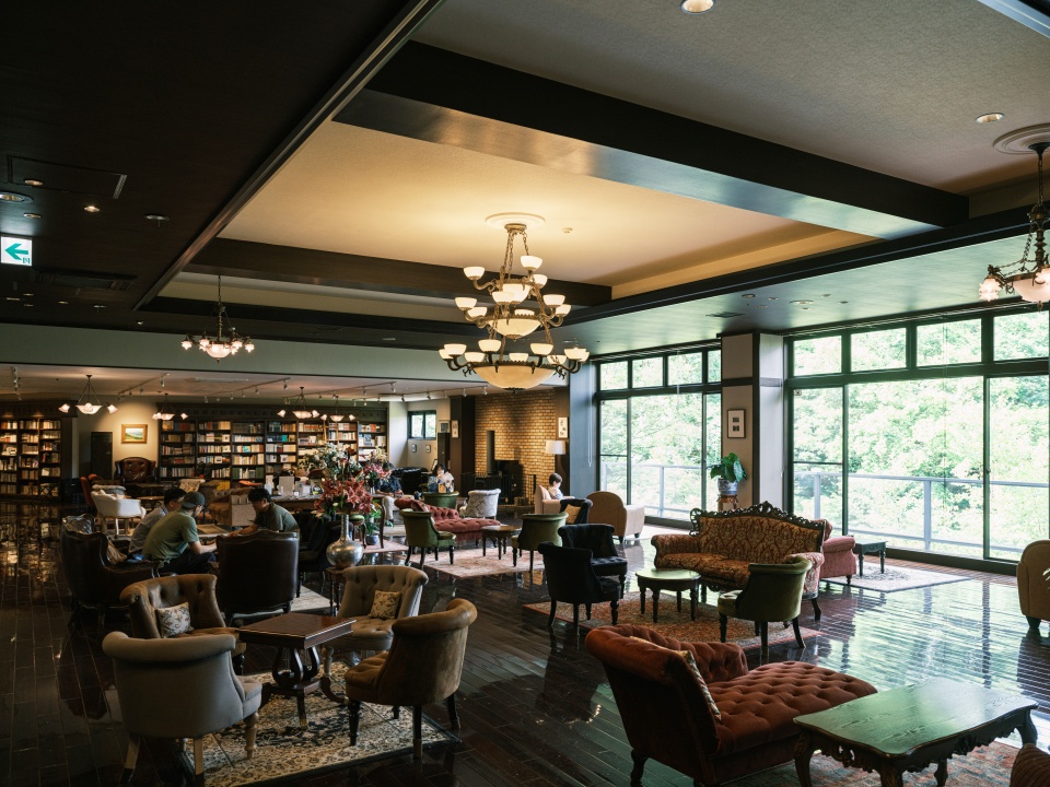 다테시나 신유 온센의 또 다른 특별한 점은 3만 5,000여 권의 장서를 보유한 로비의 라이브러리입니다. 통창으로 계곡의 숲이 풍경화처럼 보이고, 각각 다른 디자인의 소파와 테이블이 고전 영화의 세트 같은 공간을 연출합니다. 장서는 대부분 일본어책으로 구성되고, 이와나미 문고 컬렉션처럼 눈에 띄는 목록도 있습니다.