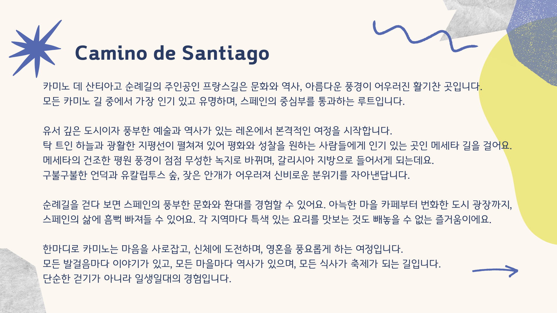 * 스페인 마드리드에서 출발하는 일정이므로 해외 거주자도 참여 가능하며, 본인 일정에 맞춰 여행 전후 프랑스, 스페인, 포르투갈 등 여행을 즐기면 됩니다. 연계 추천 여행지 정보도 온라인 설명회에서 들을 수 있습니다.